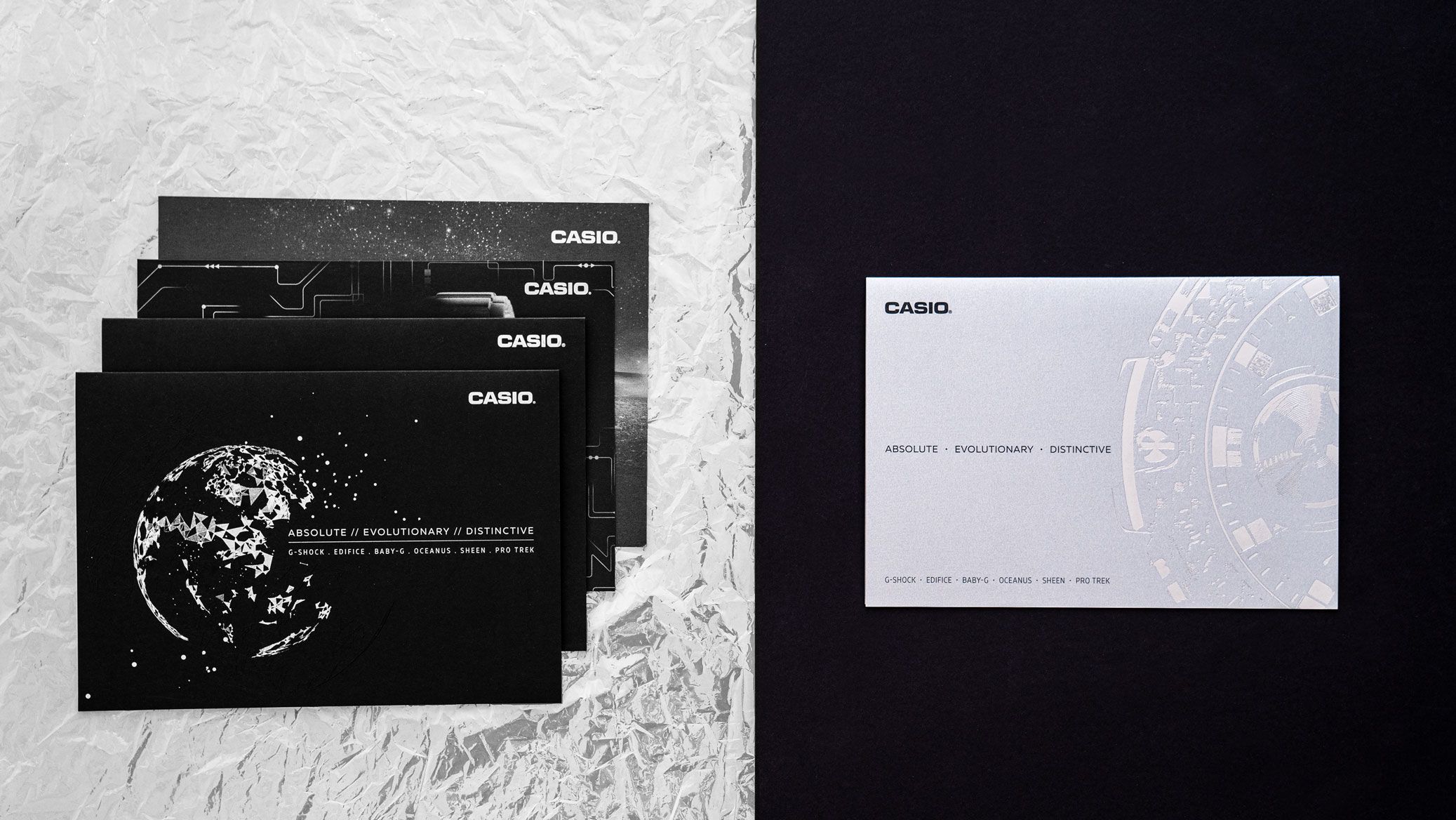Feinst-Papiere wie Lunar Nexus oder Sirio Black mit Veredelungen wie Heißfoliendruck, partieller Relieflack oder Silberdruck samt Umschläge